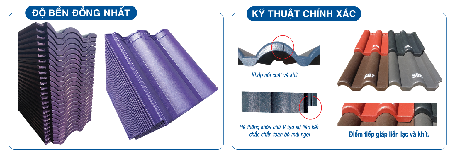 - Từng viên ngói được tạo hình một cách chuẩn xác. Các viên ngói ăn khớp, liền lạc và khít khi lợp. Loại bỏ hoàn toàn mưa tạt và thấm dột.
