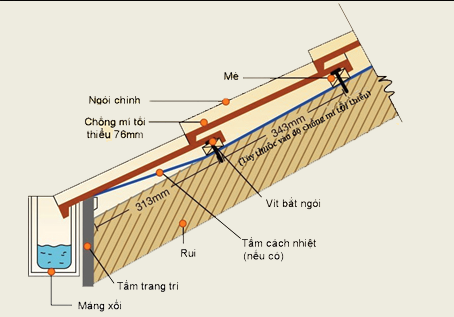 Khi độ dốc mái từ 27° đến 31° thì khoàng cách mè là 343mm và độ chồng mí là 76mm.